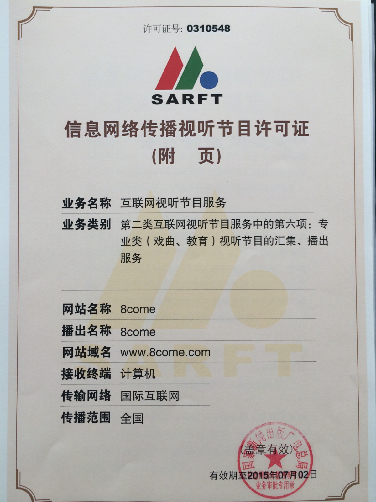 祝贺公司在2012年8月公司收到广电总局颁发的《信息网络传播视听节目许可证》。